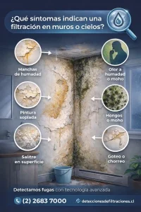 Los síntomas de filtración en muros o cielos incluyen manchas de humedad, olores desagradables y una sensación general de humedad en el ambiente, lo cual puede afectar la estructura de tu hogar si no se atiende a tiempo.